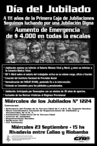 El próximo 23 de septiembre a las 15 horas frente al Congreso de la Nación (Sobre Avenida Rivadavia, entre Callao y Riobamba), los jubilados conmemorarán su día en el 1224º miércoles de lucha. Convocan a participar de la actividad, entre otras organizaciones, la Mesa Coordinadora Nacional de Jubilados y Pensionados, junto a la Central de Trabajadores de la Argentina Autónoma.