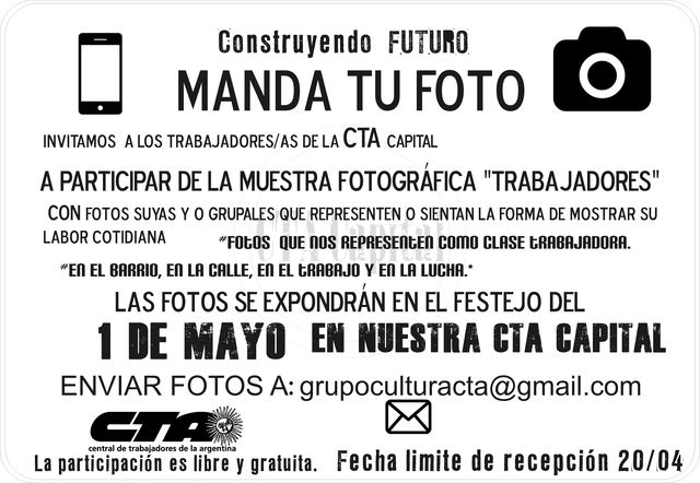Desde el espacio de Cultura de la CTA Capital invitan a participar de la muestra fotográfica que formará parte de los festejos del Primero de Mayo de este año. La muestra estará conformada por las fotos que las/los compañeras/os manden al mail: grupoculturacta@gmail.com y que ellas/llos sientan que refleje el trabajo cotidiano de nuestra organización en el barrio, en la calle, en el trabajo o en la lucha.