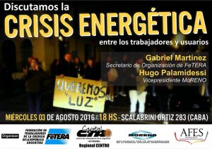 El pasado miércoles 3 de agosto se realizó en la Ciudad Autónoma de Buenos Aires la charla «Discutamos la crisis energética entre trabajadores y usuarios», en la sede de la CTA-A Capital Regional Centro con Gabriel Martínez de la FeTERA y Hugo Palamedessi del MORENO como oradores principales.