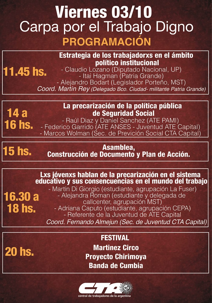 10665872_735131446552524_6091653474142604577_nContinúa la Campaña ‘Paremos la Precarización Laboral’ y comenzó el cuarto día de la Carpa por el Trabajo Digno en el Obelisco porteño. A continuación, se comparte el cronograma de actividades de la fecha, que incluye una Asamblea para las 15 horas y un Festival Artístico: