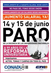 «Es por ello que el Plenario de Secretarios/as Generales de la CONADU Histórica, convocó al paro nacional los días 14 y 15 de junio con actos, tomas y carpas en todo el país. Asimismo resolvió impulsar una consulta nacional sobre la afectación de las mesas de exámenes finales de julio y el inicio del segundo cuatrimestre. El jueves 15: Acto junto a las otras federaciones frente al Ministerio de Educación a 99 años de la Reforma Universitaria. A las 12.00 horas, conferencia de prensa.