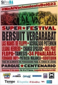 Como parte del plan de lucha, el domingo 31 de enero realizaremos un festival en Parque Centenario, con la presencia de importantes artistas de rock y folklore (Bersuit, Vergarabat, Liliana Herrero, Chango Spasiuk, Cristian Aldana y Las Manos de Filippi, entre otras bandas), para seguir difundiendo nuestra lucha y reuniendo recursos para el Fondo de Lucha que es, hoy, el único sustento que tienen los compañeros que no cobran desde noviembre.
