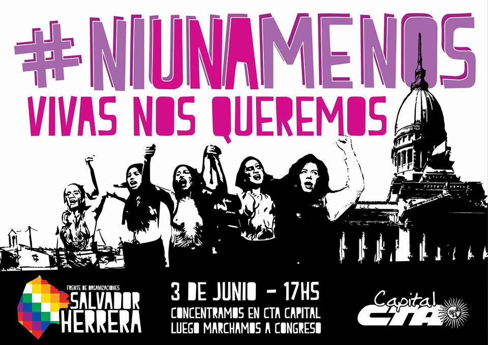 El Frente de Organizaciones Territoriales Salvador Herrera se suma al grito de #NiUnaMenos y convoca a movilizarse este viernes 3 de Junio al Congreso de la Nación. La concentración será a las 17 horas en la puerta de la CTACapital, Avenida Independencia 766.