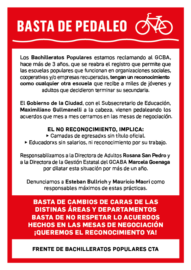 Teniendo en cuenta que los Bachilleratos Populares no son propuestas educativas alternativas sino escuelas públicas y populares reconocidas oficialmente por el Estado de la Ciudad, que consideran a la educación como práctica política transformadora y reivindican la figura de las parejas pedagógicas como apuesta para democratizar la educación, entienden que este es un nuevo ataque del macrismo a la Educación Pública.