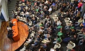 El Secretario General de la CTA, Pablo Micheli, sentado junto a su Adjunto, Ricardo Peidró, y Daniel Jorajuría, Secretario Gremial de la Central, trajo su solidaridad y recordó que jamás desde la vuelta de la democracia un gobierno se había atrevido a intervenir las elecciones generales de ATE.
