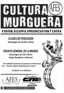 – Los domingos está ensayando la murga de la regional, la murga de la Asociación para el Fortalecimiento de Espacios Sociales (AFES), en Warnes y Jorge Newbery. De 16.30 a 18 son las clases de percusión para murga y de 18 a 20 horas es el ensayo general de la murga. Así que están todos invitados tanto el sábado a las 22.30 a las sesiones de improvisación de Jazz y música popular y los domingos de 16.30 a 20 clases y ensayos de murga.