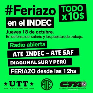 Los trabajadores del INDEC realizarán este jueves a partir de las 12.00 una feria que se desarrollará en las puertas del Instituto Nacional de Estadísticas y Censos en Diagonal Sur 609. El denominado feriazo se desarrollará a partir de las 12 horas y será para defender los salarios y los puestos de trabajo.