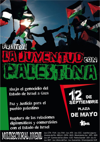 Como primera iniciativa los compañeros y compañeras vieron de vital importancia generar un Festival que tenga como principal objetivo frenar la masacre realizada por el Estado de Israel en Franja de Gaza, porque creen que la juventud tiene que tener una solidaridad activa, reclamando Paz y Justicia para el pueblo palestino. En relación a eso le reclamarán al Gobierno la ruptura de las relaciones diplomáticas y comerciales con el Estado de Israel, siguiendo los pasos ya dados por otros países sudamericanos.