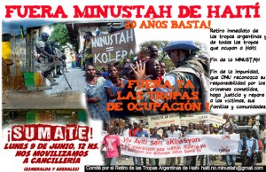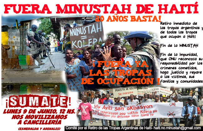 El próximo lunes 9 de junio a las 12 horas la CTA Capital junto con el Comité por el Retiro de las Tropas Argentinas de Haití, se movilizará a la Cancillería Argentina -Ubicada en Esmeralda y Arenales- para exigir, a 10 años de la ocupación: “¡Fuera Minustah de Haití!, retiro inmediato de las tropas que ocupan Haití y el fin de la impunidad, que ONU reconozca su responsabilidad por los crímenes cometidos haga justicia y repare a las víctimas, sus familias y comunidades”.