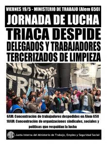 Trabajadores de limpieza tercerizados despedidos por el Ministro Jorge Triaca, la Junta Interna de ATE y la conducción de la CTA-Autónoma anunciaron en conferencia de prensa una jornada de lucha este viernes 19/5, a partir de las 6 de la mañana, en la puerta de Alem 650, para exigir la reincorporación de los/as 33 trabajadores/as de limpieza despedidos el pasado 2 de mayo.