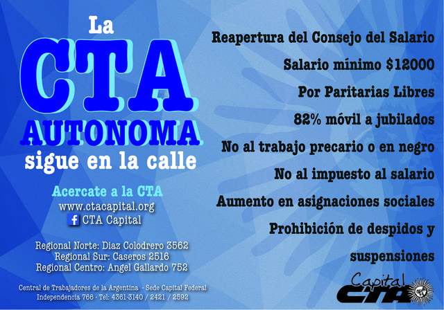 La CTA de Capital llevará a cabo este jueves 28 de mayo una Jornada de Lucha con cortes de calle y actividades de difusión, con vistas al Paro Nacional de 36 horas del próximo martes 9 de junio.