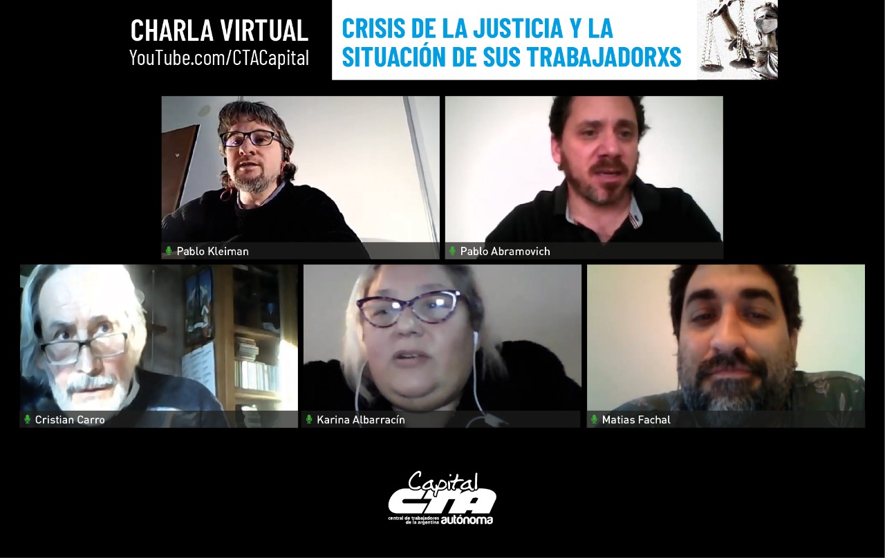 Organizada por el Espacio Jurídico de la CTAA Capital, en la tarde de ayer se llevó a cabo -a través de videoconferencia- la disertación virtual titulada “Crisis de la Justicia y situación de sus trabajadorxs”. Participaron de la charla compañeros y compañeras de la Asociación Judicial Bonaerense, de la Comisión Interna del Fuero del Trabajo (UEJN), de la Federación Judicial Argentina (FJA) y de la Asociación de Empleados Judiciales de la Ciudad Autónoma de Buenos Aires (AEJBA).