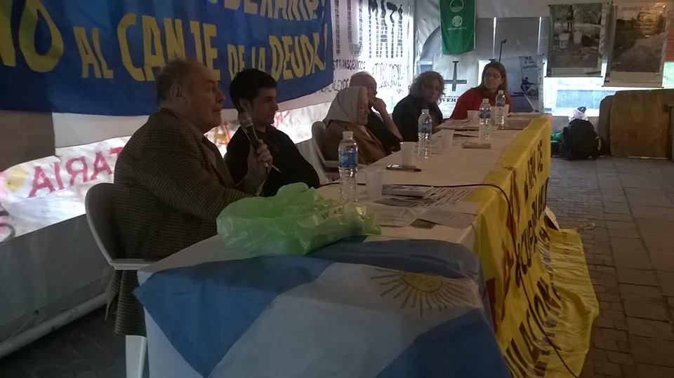 Jaime Fuchs, Economista, retomó el hilo de la deuda, insistiendo en la necesidad de reconocer que la misma es una vil mentira; que en realidad no es deuda del pueblo, sino el trabajo mismo nuestro, los bienes de nuestro patrimonio y futuro, lo que se roba de los bolsillos de cada trabajador y trabajadora, de cada niño que nace. Ante el silencio cómplice de la inmensa mayoría de la dirigencia política, el ocultamiento del Caso Olmos y de las pruebas contundentes de la fraudulencia de la deuda, instó a que nos unamos en la lucha para que se suspenda todo pago y poder descolonizarnos, reconociendo que vivimos ya en un territorio ocupado, que ya somos todos víctimas de las grandes buitres que ocupan nuestro suelo y posibilidades de vida.