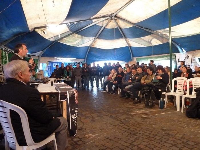 En la apertura de la Asamblea, José “Pepe” Peralta, secretario General de la CTA Capital, expresó: “Este plenario iba a ser el acto de cierre de la Carpa por el Trabajo Digno, pero ayer la mesa de la CTA Capital reunida aquí mismo –donde la Central funcionó toda la semana- ha resuelto darle continuidad a la Carpa hasta el miércoles 8 a la mañana, por varias buenas noticias que hemos tenido en estos cuatro días.”