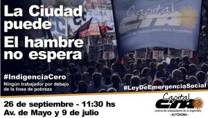 La CTAA de Capital, junto a organizaciones sociales que lograron la votación de la Emergencia Social a nivel nacional realizarán este martes una caravana por la ciudad, desde Callao y Corrientes hasta la Legislatura Porteña, bajo la consigna “La ciudad puede. El hambre no espera”.