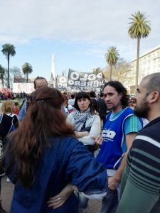 Alicia Coca, integrante de la Mesa Nacional de la CTA Autónoma agregó: “Nosotras nos solidarizamos principalmente con las mujeres porque son, frente a una coyuntura económica tan desfavorable, las más perjudicadas, somos las que volvemos a casa, cocinamos, contestamos los cuadernos de comunicación y al otro día debemos levantarnos y seguir. Hoy repudiamos toda la violencia que fue ejercida contra las trabajadoras y especialmente contra las mujeres trabajadoras porque la clase política se llena la boca con Ni una Menos pero hoy fueron golpeadas brutalmente nuestras compañeras y no vimos ningún cartel”.