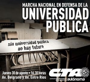 Durante la jornada de mañana la CTA Autónoma marchará junto a la comunidad educativa, el estudiantado, los docentes universitarios y los auxiliares de la educación «EN DEFENSA DE LA EDUCACIÓN PÚBLICA convocada por la CONADU Histórica y otras federaciones docentes, estudiantiles y no docentes, que se espera que sea histórica y que se realizará a las 17.00 desde Congreso a Plaza de Mayo (la CTA-A concentra en Belgrano y Entre Ríos a las 16:30).