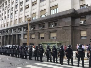 El desmedido despliegue policial ostentado esta mañana demuestra que el ajuste no pasa sin represión. Reacciones como esta refuerzan la idea de que estamos en el camino indicado. Seguiremos en la calle, en los ruidazos de cada viernes, organizándonos en nuestros lugares de trabajo, en nuestros barrios, en las plazas y en cada lugar donde esté nuestro pueblo.