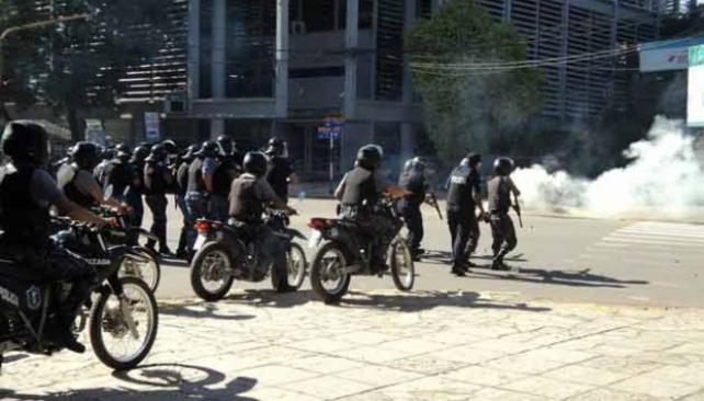 Nuevamente en la ciudad de Resistencia, la policía corrió y reprimió manifestantes fuera de la plaza 25 de Mayo con carros hidrantes, balas de goma, y gases. Heridos y detenidos en números imprecisos hasta el momento es el saldo de una brutal agresión policial a integrantes de pueblos originarios, trabajadores/as estatales, movimientos de desocupados, y a varios sindicatos.