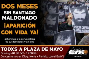 La CTA Autónoma de Capital adhiere a la convocatoria de familiares y amigos de Santiago Maldonado y convoca a movilizar este domingo 1 de octubre al cumplirse dos meses de su desaparición forzada. La concentración de la Central porteña será a las 15 horas en la Esquina de Diagonal Norte y Florida, junto al Encuentro de Memoria Verdad y Justicia.