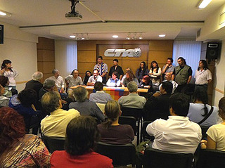 Con escasa presencia mediática pero con la sala llena de compañeros y compañeras de diferentes organizaciones sociales, políticas y sindicales, Pablo Micheli, secretario General de la CTA, dio inicio a la conferencia de prensa: «Somos conscientes que los medios masivos no iban a estar presentes pero saludamos a todos los compañeros y compañeras que nos acompañan hoy como el diputado nacional Víctor de Gennaro, Marta Maffei y Jorge Cardelli».