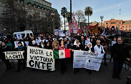 En Buenos Aires, las Madres de Plaza de Mayo, junto a otras organizaciones de derechos humanos, la Asamblea de Mexicanos en Argentina e integrantes de la CTA realizaron la tradicional ronda de los jueves incluyendo el pedido de verdad y justicia por los docentes mexicanos, los 42 estudiantes normalistas y porque se termine con las políticas neoliberales en todo el continente.