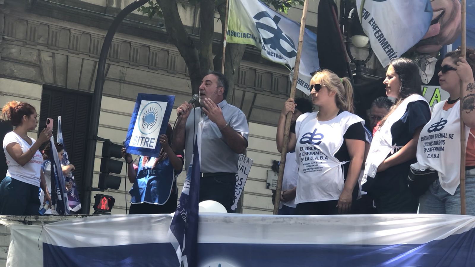 Nancy Rojas, secretaria General del Sindicato de Enfermería (SITRE-CTAA) durante la concentración en el Congreso expresó: “Queremos que abran paritarias que estén por encima de la inflación, porque se están cerrando por debajo, entonces hoy somos trabajadores pobres. Queremos unas buenas condiciones laborales y el reconocimiento profesional que nos lo dio la Jueza López Vergara, quien falló a nuestro favor y posteriormente el Gobierno de la Ciudad apeló como lo ha venido haciendo estos cuatro años. Hoy es un día de lucha, hoy estamos acá porque no podemos vivir con estos sueldos magros que tenemos.”