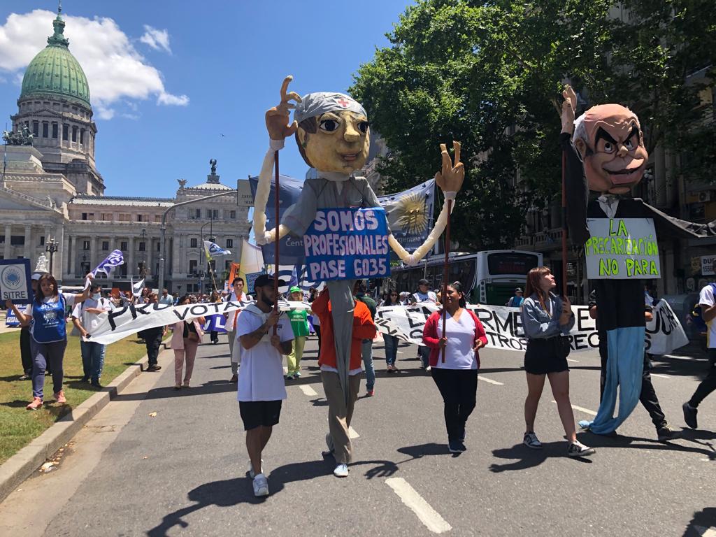 Al llegar frente al Cabildo el camión de sonido volvió a oficiar de escenario. Desde allí, Jorge Yabkowski, secretario General de la Federación de Asociaciones Sindicales de Profesionales de la Salud de la República Argentina (FeSProSa-CTAA) dijo: “Somos profesionales, todos; somos trabajadores de de la salud, todos y somos parte de la gran marea blanca que está recorriendo la Argentina pidiendo dignidad para todos las y los trabajadores de la salud. Esta lucha es de todos los trabajadores de la salud, es una lucha nacional y vamos al Paro General con toda la fuerza”.