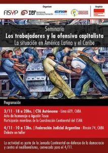 En el marco de la reunión de la Coordinación continental del Encuentro Sindical Nuestra América (ESNA), que se realiza los días 2 y 3 de noviembre, el Instituto de Estudios y Formación de la CTA Autónoma (IEF-CTA-A) y la Fundación de Investigaciones Sociales y Políticas (FISYP), con el auspicio de la Fundación Rosa Luxemburgo organizan el Seminario “Los Trabajadores y la ofensiva capitalista. La situación en América Latina y el Caribe” a realizarse el 4 de noviembre del 2016 de 10.00 a 13.00 horas. Habrá un intercambio abierto de opiniones en forma de taller del que surgirá una publicación que recoja lo principal de las intervenciones.