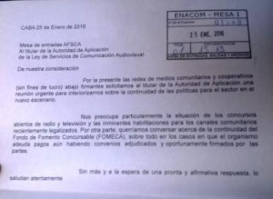 El lunes 25 de enero, todas las redes de medios comunitarios se presentaron en la sede de la Autoridad Federal de Servicios de Comunicación Audiovisual (AFSCA), para pedir una reunión urgente con la autoridad en funciones.
