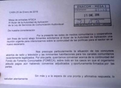 Además de presentar una carta formal en Mesa de Entradas, los representantes de las redes pudieron hablar con la secretaria de Agustín Garzón, hasta ese entonces el director del Ente Nacional de Comunicaciones-ENACOM (creado por decreto 267/2015) quien les prometió una pronta respuesta.