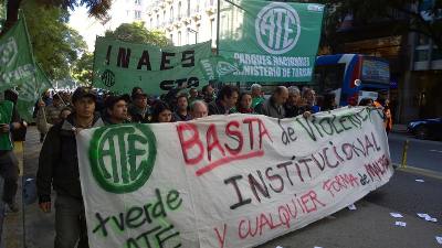 Los trabajadores de la Administración de Parques Nacionales, nucleados en ATE, realizaron una movilización ayer al Ministerio de Turismo mientras esperaban que el Ministro Meyer los reciba para debatir sobre los reclamos que llevan adelante ante la falta de respuesta al petitorio presentado el 19 de marzo.