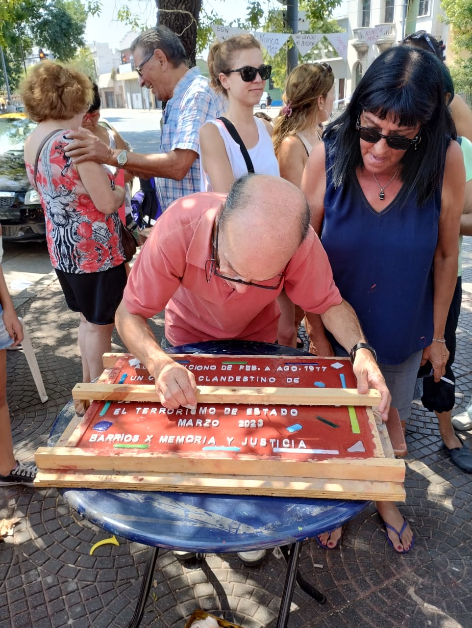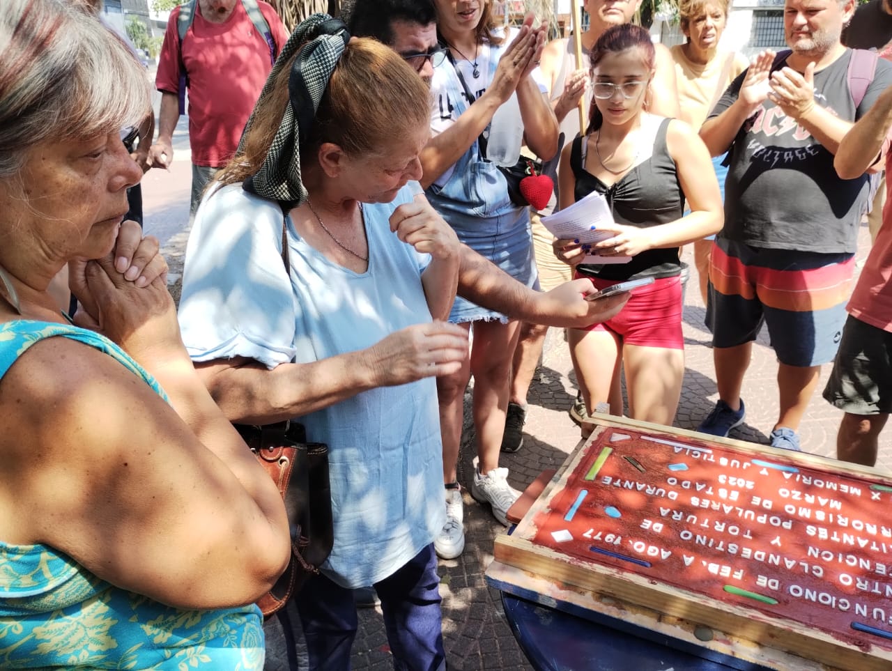 “Algunos de ellos están detenidos y otros con pedidos de captura, por eso hoy todos los compañeros participaron señalizando el lugar (que es de un privado y que exhibe un cartel de venta) con volantes y con cánticos, y con la confección de una Baldosa de la Memoria que será colocada el 17 de Marzo en la puerta del lugar”, finalizó López.