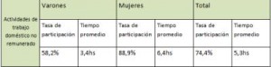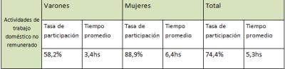 Todas estas tareas se distribuyen desigualmente entre varones y mujeres. Constituyendo para las mujeres, muchas veces, el establecimiento de una doble jornada laboral. En un relevamiento del Ministerio de Trabajo, se evidencia esta disparidad.