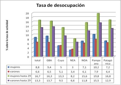 Hay diferentes indicadores en lo que a desigualdad de acceso al empleo refiere. A continuación se analizarán los correspondientes a: 1) desempleo, entendido como la magnitud de la dificultad de acceso a puestos de trabajo; 2) puestos de trabajo, entendido como la magnitud del acceso diferencial a puestos según jerarquía; 3) salarios, entendido como la diferencia monetaria existente entre varones y mujeres que realizan las mismas tareas; 4) trabajo doméstico, entendido como el trabajo destinado a tareas reproductivas en el hogar. Sabemos no obstante, que muchos indicadores quedan fuera de este relevamiento pero el objetivo es dar una mirada general de conjunto que posibilite la realización de nuevas preguntas.