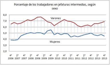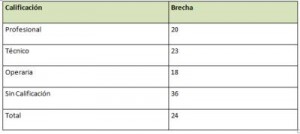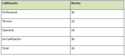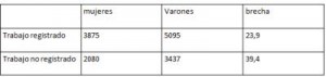 En la tabla anterior se observa la brecha salarial entre varones y mujeres y se ve cómo la misma se profundiza entre los trabajadores y trabajadoras no registrados. Los datos presentados son a 2013, pero si se observa su evolución vemos una mejoría en la condición de las trabajadoras registradas, que pasaron de una brecha del 27,8 en 2004 a una de 23,9 en la actualidad y un empeoramiento significativo de las condiciones de las mujeres que realizan trabajos no registrados, que pasaron de una brecha del 33,9 en 2004 a una del 39,4 en la actualidad.