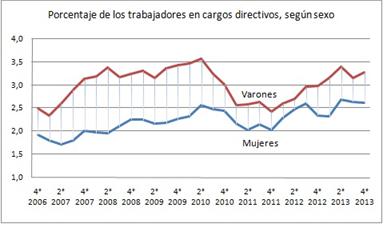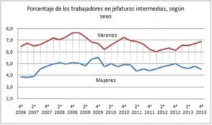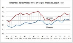 En este cuadro podemos observar la preferencia de las patronales de contratar varones para los puestos directivos. Esta situación se da no obstante, la calificación profesional en nuestro país es mayor en las mujeres que en los varones.