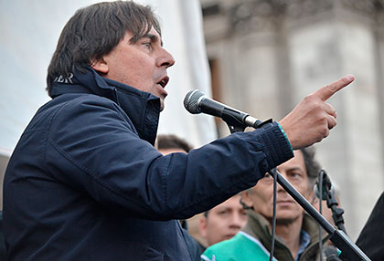 “A nosotros jamás nos van a ver retroceder ante el imperio, ni un paso atrás, ni siquiera para tomar impulso. Por eso no debemos pagarle ni un centavo a los Buitres ni a ningún organismo internacional. Nos importa un carajo el bloqueo y el default. Latinoamérica tiene suficiente para no depender de ningún imperio. Hacer patria es ser soberanos”, dijo Micheli a la vez que era aplaudido por la multitud de trabajadores.