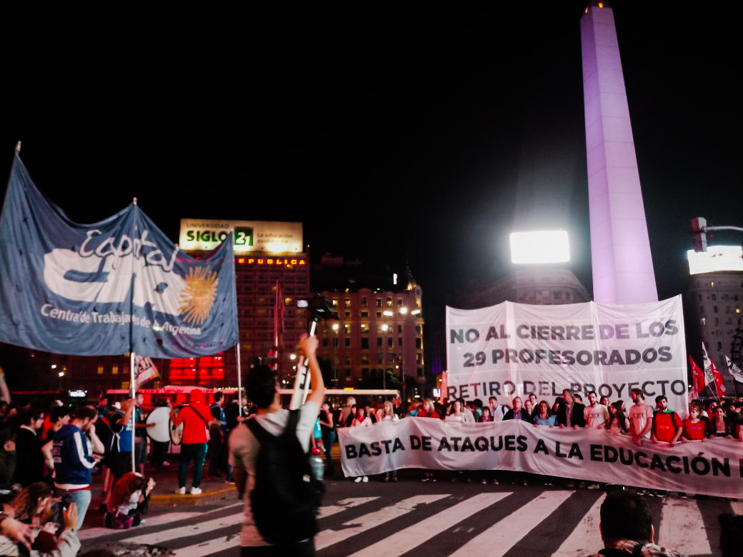 Durante la tarde de hoy la CTAA Capital estuvo acompañando la lucha de los trabajadores y trabajadoras de los profesorados de la Ciudad junto a los estudiantes, quienes marcharon desde Avenida de Mayo y 9 de Julio hacia la Legislatura de la Ciudad de Buenos Aires para hacer escuchar sus voces, una vez más, en contra del proyecto oficialista de crear una única Universidad de la Ciudad (UNICABA).