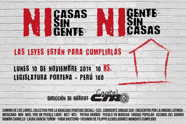 La Dirección de Hábitat de la CTA Capital convoca a concentrarse este lunes 10 de noviembre a las 10 de la mañana en la Legislatura de la Ciudad de Buenos Aires -Perú 160-, momento en el cual se estará discutiendo dentro del recinto el presupuesto asignado al área de vivienda. Este representa un 2,4% del total del presupuesto de la Ciudad para el año 2015, disminuyendo con respecto a años anteriores.