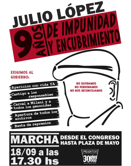 Hoy viernes 18 de septiembre se cumplen 9 años de la desaparición de Julio López, testigo clave en el juicio contra el genocida Miguel Etchecolatz. Por esta razón, la CTA Capital adhiere y convoca a participar junto con los Organismos de Derechos Humanos y otras organizaciones del campo popular de la movilización que se realizará esta tarde a partir de las 17.30 horas desde el Congreso a la Plaza de Mayo.