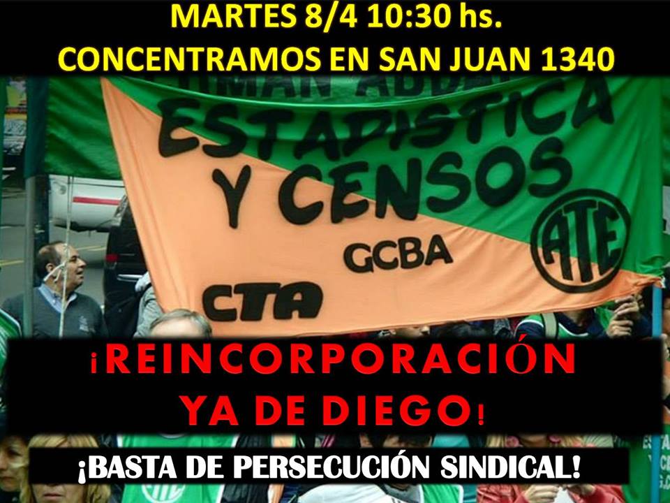 ImageProxy.mvcLa Junta Interna de la Asociación Trabajadores del Estado (ATE-CTA) en Estadística y Censos de la Ciudad de Buenos Aires llevará a cabo este martes 8 de abril a las 10.30 horas una Jornada de Lucha por la Reincorporación de un trabajador precarizado de la Subdirección Sociodemografica, perseguido por  su actividad gremial.