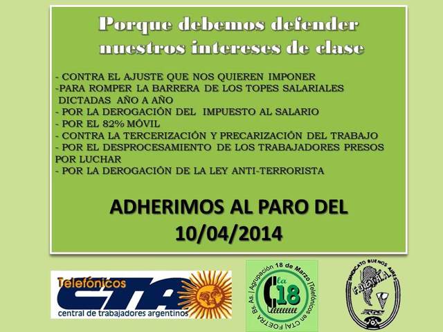 Los compañeros y compañeras Telefónicos en la CTA, organizados a la Agrupación 18 de marzo-Foetra enviaron su adhesión al paro convocado por la CTA para el próximo jueves 10 de abril y explicaron las razones de su apoyo. A continuación se publica el comunicado elaborado por la organización.