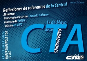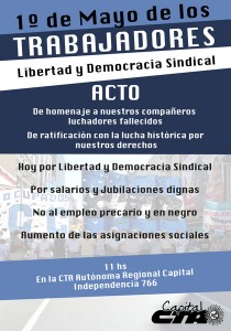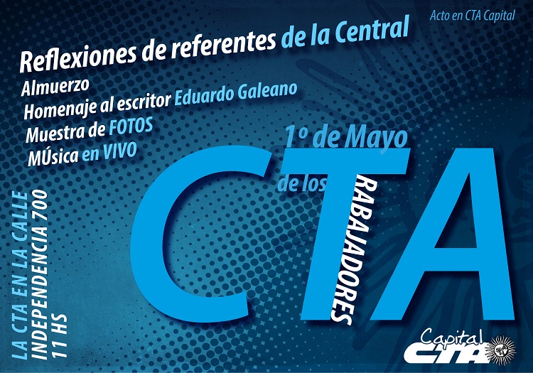 El próximo viernes 1º de mayo a partir de las 11 horas se llevará a cabo en las puertas de la CTA Capital -Avenida Independencia 766- un Acto de homenaje a ‘nuestros compañeros fallecidos, de ratificación con la lucha histórica por nuestros derechos’, bajo las consignas “Por Libertad y Democracia Sindical, por Salarios y Jubilaciones Dignas, No al empleo precario y en negro y aumento de las asignaciones sociales”.