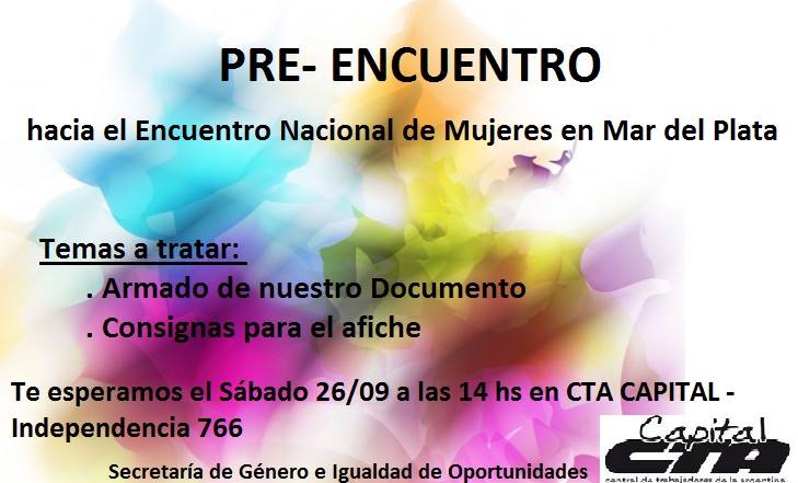 El sábado 26 de septiembre a partir de las 14 horas se llevará a cabo en la sede de la Central porteña -Avenida Independencia 766- el Pre-Encuentro de Mujeres. El mismo es preparatorio del viaje de las compañeras al ENM Mar del Plata 2015, que se desarrollará durante los días 10, 11 y 12 de octubre.