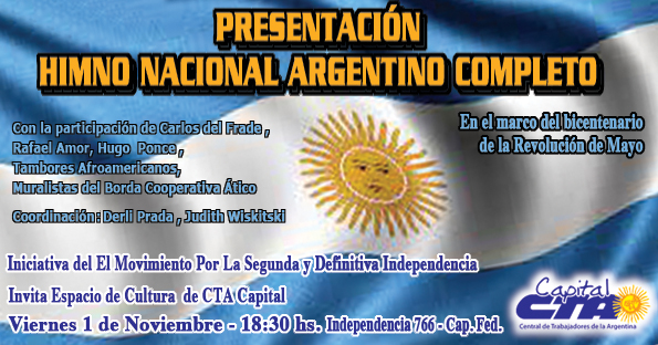 El Espacio de Cultura de la CTA Capital invita a presenciar el próximo viernes 1 de noviembre a las 18.30 horas en la sede de la Central porteña -Avenida Independencia 766- la presentación del Himno Nacional Argentino en su versión completa, en el marco del Bicentenario de la Revolución de Mayo.