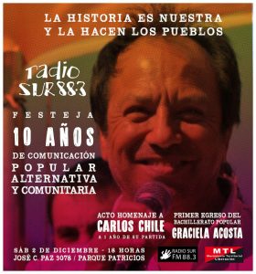 Hoy sábado 2 de diciembre a partir de las 18 horas en José C. Paz 3078, Parque Patricios, en el corazón de Monteagudo, Radio Sur FM 88.3 festeja 10 años de Comunicación Popular Alternativa y Comunitaria.