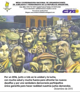 Los compañeros y compañeras que forman parte de la Mesa Coordinadora de Jubilados y Pensionados de la República Argentina enviaron a la CTA su saludo de Fin de Año, que compartimos a continuación: “Por un 2016, junto a ustedes en la Unidad y la Lucha, con mucha salud y mucha fuerza para afrontar los nuevos desafíos y por una verdadera democracia participativa, única garantía para hacer realidad nuestras justas demandas.”