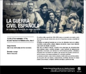 El viernes 13 de noviembre a la 17 horas (con duración de 2 horas) se inicia un ciclo de charlas sobre la Guerra Civil española presentado por el compañero Daniel Campione en la Biblioteca Nacional (Agüero 2502-Bs. As). El ciclo contará con 3 encuentros, los viernes 13, 20 y 27 de noviembre.