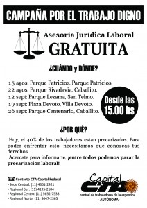 El próximo sábado 15 de agosto a partir de las 15 horas en el Parque Patricios se realizará la primera de cinco actividades de difusión, bajo la consigna “Ningún trabajador/ra precarizado”. Hoy el 40% de los trabajadores está precarizado. Para poder enfrentar esto necesitamos que conozcas tus derechos. Acercarte para informarte, ¡Entre todos podemos parar la precarización laboral!